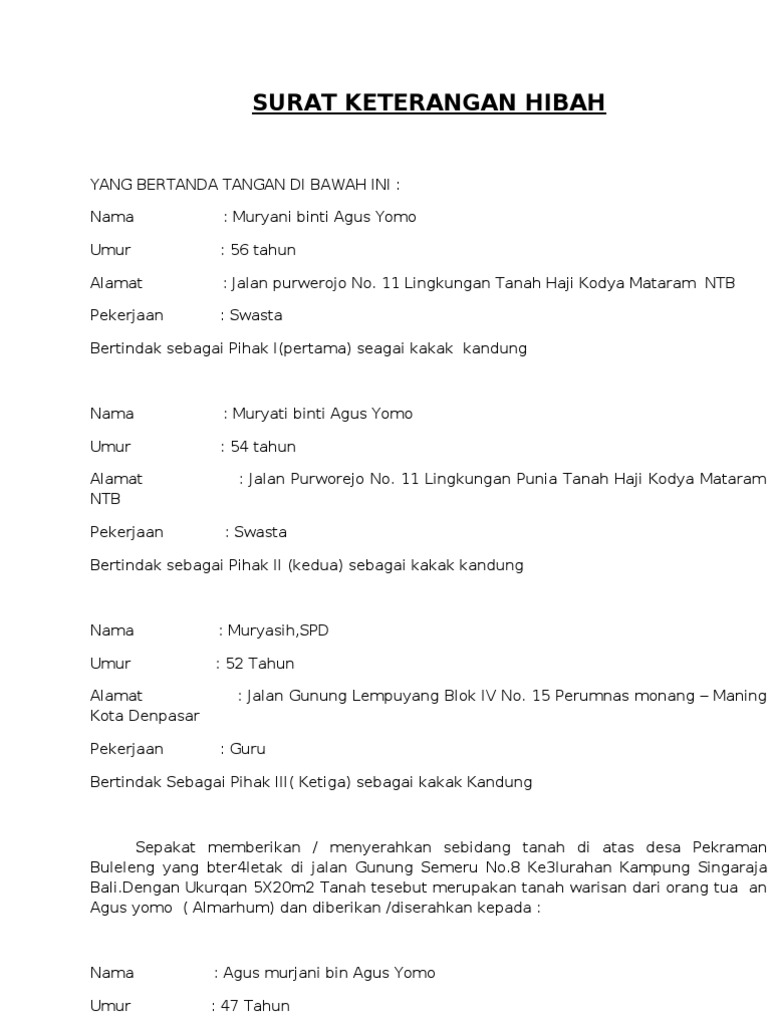 Surat penyerahan hak milik atau hibah biasa dibuat untuk memperkuat status kepemilikan yang berasal dari pemberian atau hibah misalnya dari orang tua ke anak. Untuk anda yang ingin mengadopsi anak, anda membutuhkan surat perjanjian adopsi anak. Jika anda memiliki tanah berupa warisan dari orang tua, namun tidak berniat untuk menggunakan atau menjual tanah tersebut, maka. Contoh surat pernyataan tanah hibah tanah tanah wakaf. Surat hibah juga berlaku jika diberikan kepada mesjid. Surat penyerahan hak milik atau hibah biasa dibuat untuk memperkuat status kepemilikan yang berasal dari pemberian atau hibah misalnya dari. Surat hibah ini hampir mirip dengan surat wasiat yang telah kita. Namun pembuatan surat hibah tanah harus di beritahukan kepada ahli waris agar tidak terjadi kesalahan surat hibah tanah bisa dijadikan sebagai bukti sah di mata hukum. Contoh surat hibah tanah warisan. Penanda tanganan surat hibah ini juga disertai dengan penyerahan sertfikat hak milik tanah dari pemberi hibah kepada penerima. Surat pernyataan hibah tanah pada dasarnya menyatakan bahwa tanah yang anda punya sekarang merupakan hasil hibah atau bisa juga dalam kondisi anda menghibahkan tanah milik anda kepada orang lain. Hal yang harus kita ingat bahwa hibah ini berbeda dengan warisan. Salah satu bentuk harta yang sering dihibahkan oleh seseorang adalah harta berupa tanah.