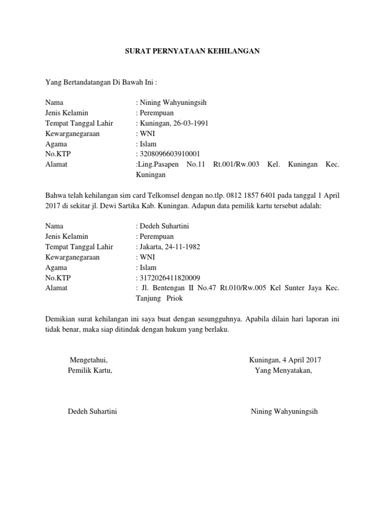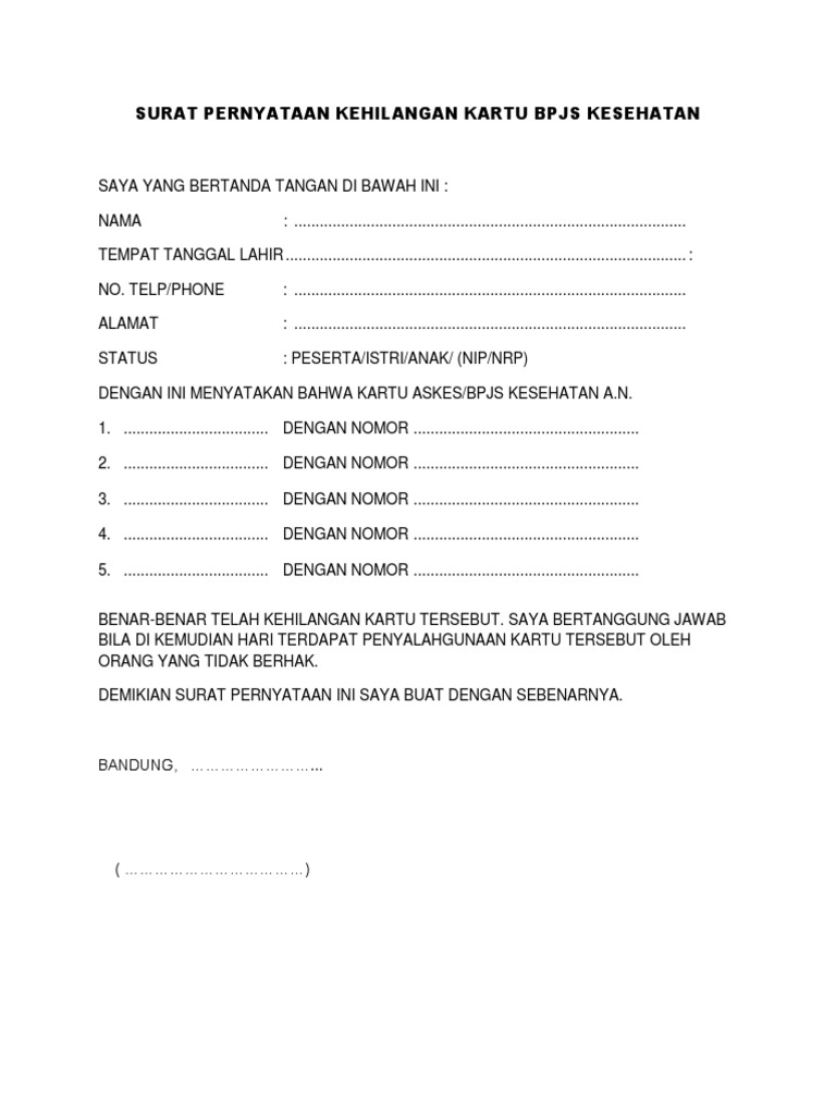 Dengan ini menyatakan telah kehilangan kartu bpjs atas nama: Doc pengajuan perbaikan kartu peserta bpjs ketenagakerjaan hrd sumber dari : Tata cara mengurus surat kehilangan lengkap tips cara format 601 x 666 contoh surat pernyataan kehilangan ktp format 595 x 842 pixel download contoh surat pernyataan kehilangan yang anda perlukan format 561 x 522 pixel download surat pernyataan kehilangan. Contoh surat pernyataan kehilangan, surat ini biasanya diperlukan untuk menyatakan bahwa telah kehilangan suatu barang berharga pada saat barang berharga yang sering terjadi kehilangan diantaranya seperti kartu identitas atau ktp, kartu mahasiswa, sim, stnk, bpkb dan lain sebagainya. Yang bertanda tangan di bawah ini saya: